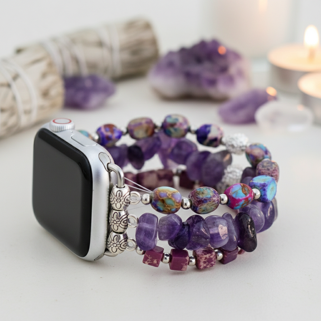Chaque bracelet est façonné avec de véritables pierres choisies pour leur présence et leurs vertus — assemblé avec soin, conçu pour reposer sur le point de pulsation avec un soutien discret. Chaque pièce est faite à la main — aucune n’est identique. Quand une pierre vous appelle, faites confiance à ce lien