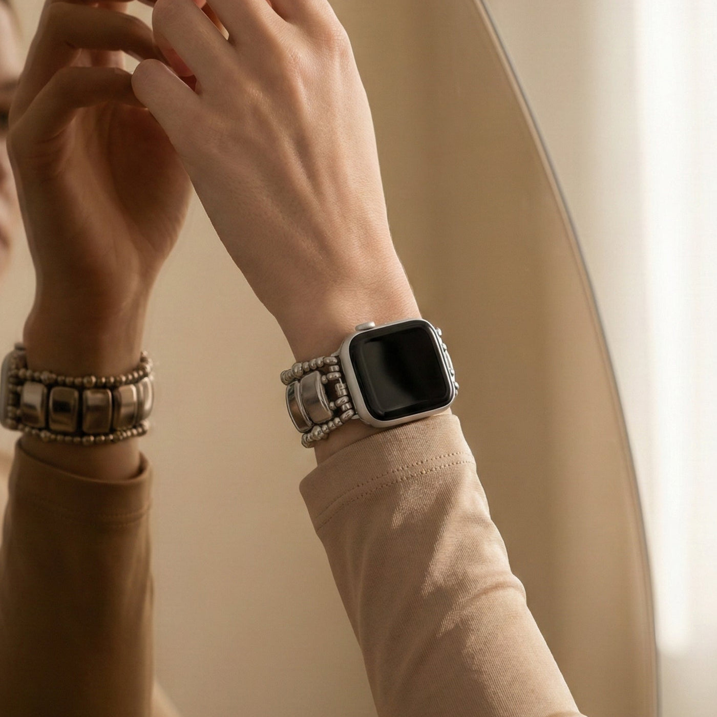 Nos bracelets en pierre et en acier sont conçus pour s’harmoniser avec vos bijoux et parfaire le style — car quand la tenue est soignée, le poignet doit suivre.
